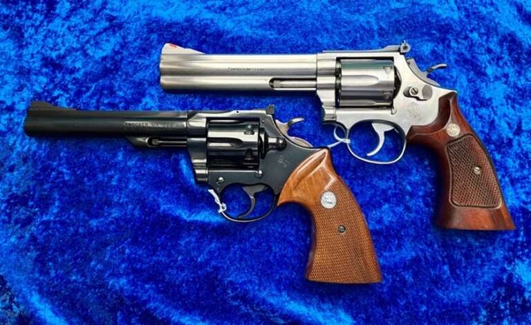 Un exemple : S&W 686 bouton du barillet à pousser vers l’avant et rotation du barillet anti horlogique, Colt Trooper bouton du barillet à pousser vers l’arrière et rotation du barillet dans le sens horlogique.