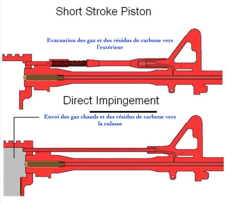 On distingue 2 systèmes d’utilisation des gaz, le « Stroke Piston» et le «Direct Impingement ». Un dessin valant souvent mieux qu’un long discours voici les principes des 2 systèmes.