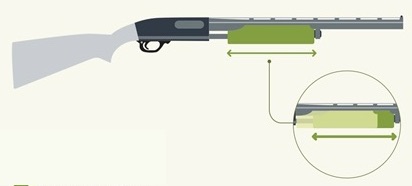- Fusil à pompe ( FAP) on réarme on tirant vers l’arrière le garde main ce qui a pour effet de faire reculer le verrou et ensuite on pousse le garde main vers l’avant poussant de cette manière une munition dans la chambre. Les FAP se déclinent aussi en plusieurs calibres en général ce sont des cartouches de calibre 12 ou 20 ou .410.
